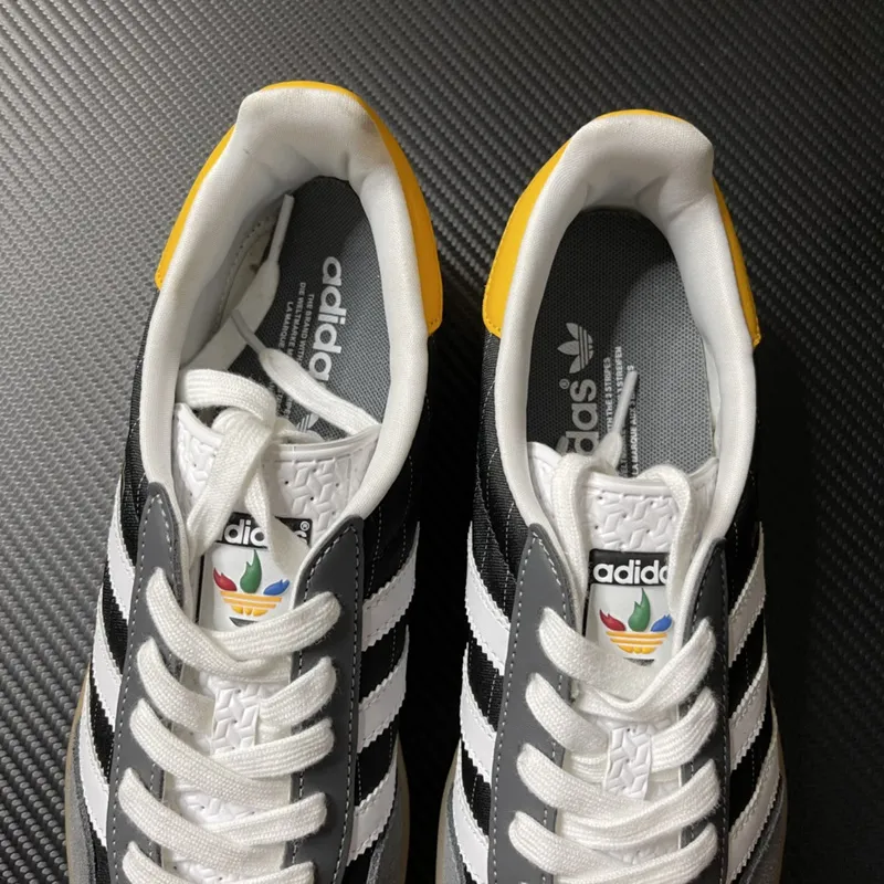 Os detalhes são onde a personalidade do “Olympic Pack Black” realmente brilha: a aba do calcanhar em amarelo vibrante, um aceno direto a um dos anéis olímpicos, adiciona um pop de cor inesperado e significativo. A língua e o forro interno garantem conforto e um acabamento impecável. Os cadarços pretos se integram perfeitamente ao design, reforçando a elegância da colorway.