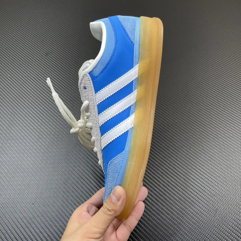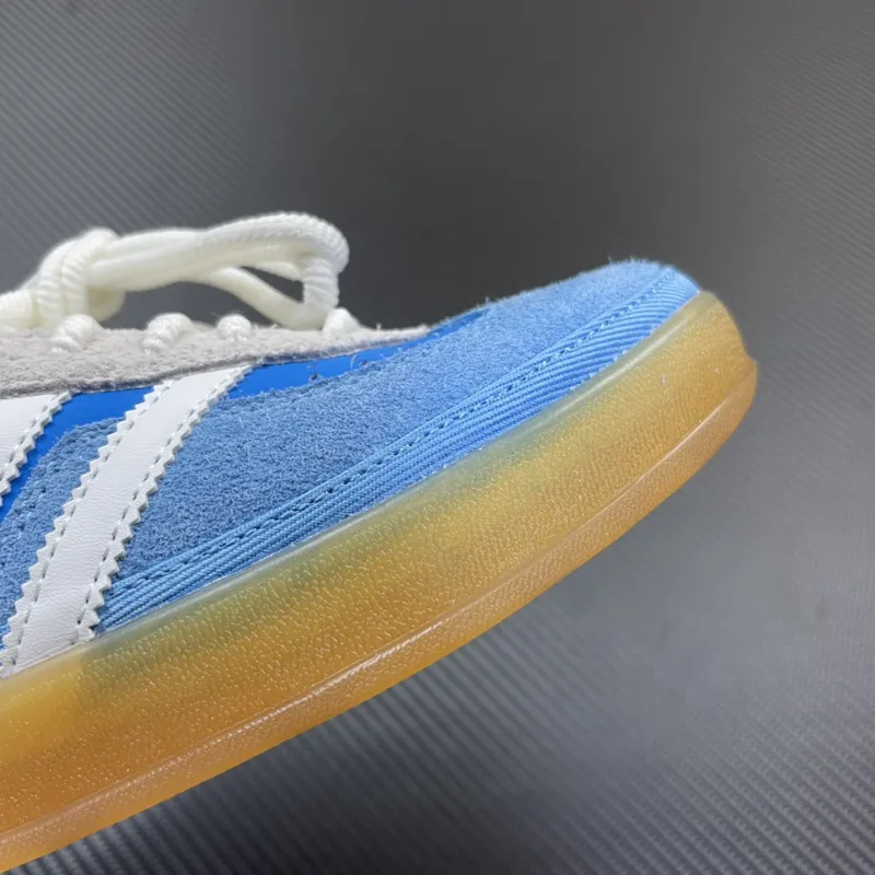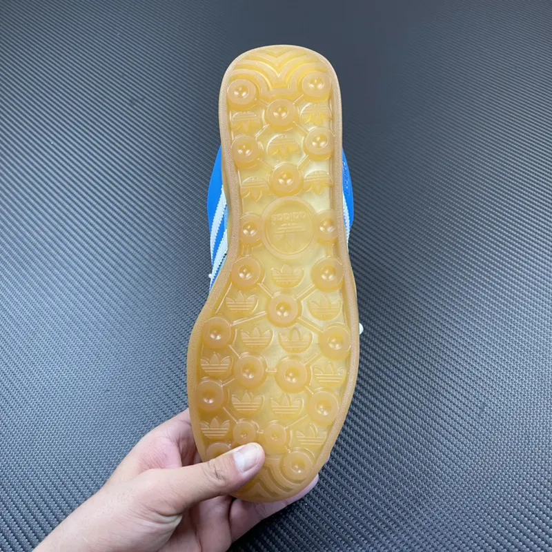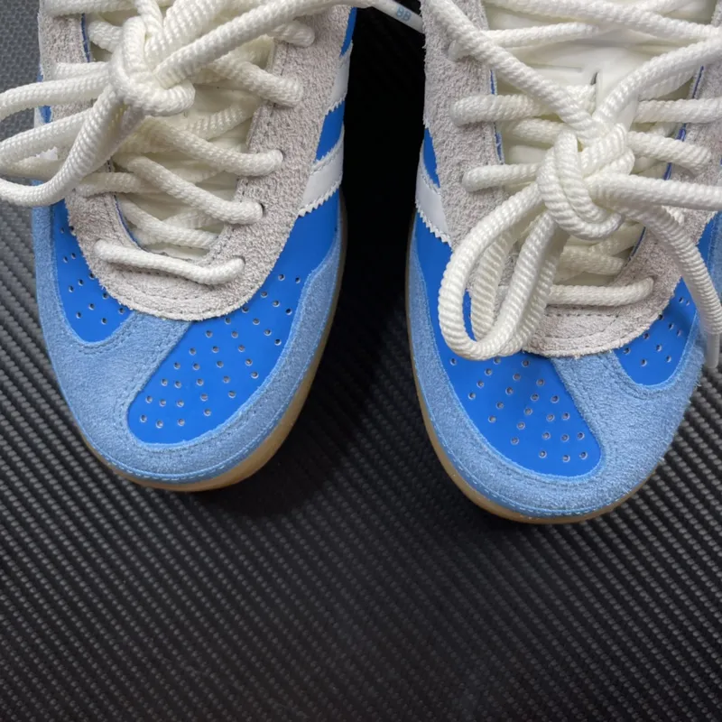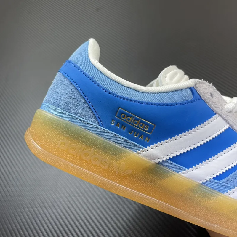 O cabedal mescla camurça premium em azul celeste na parte traseira e sobreposições com couro liso em azul vibrante, criando um contraste elegante e dinâmico. As Três Listras serrilhadas em branco e a biqueira em T de camurça clara mantêm a herança do Gazelle, enquanto o detalhe em dourado “adidas SAN JUAN” na lateral adiciona um toque sofisticado e exclusivo, reafirmando a inspiração local.