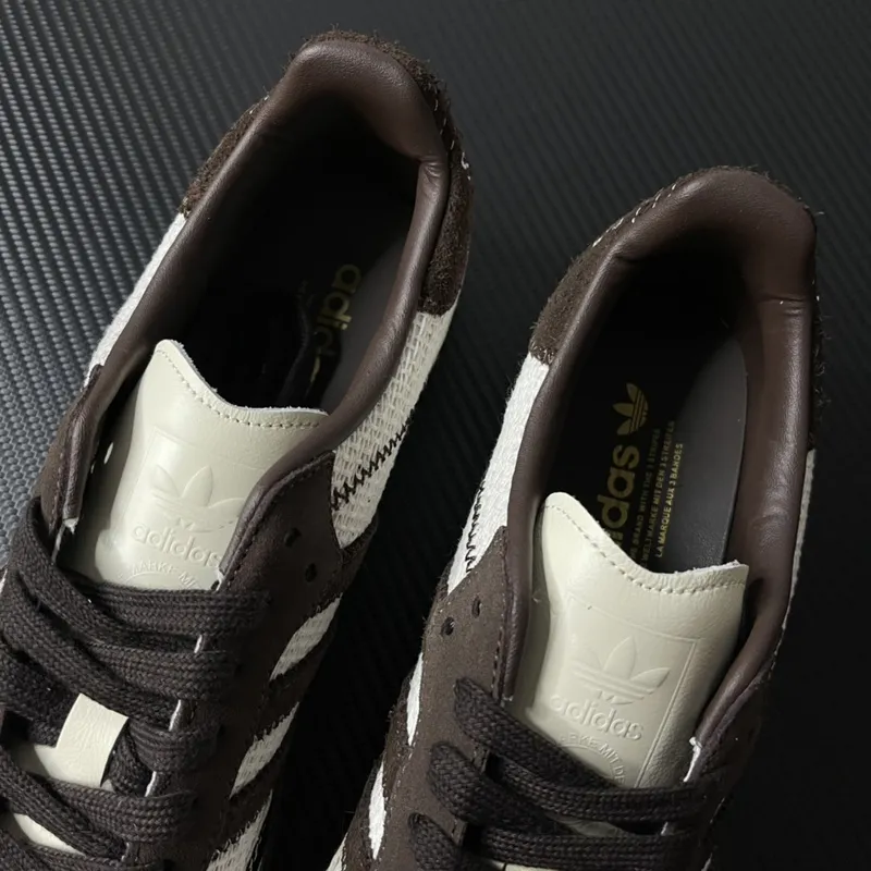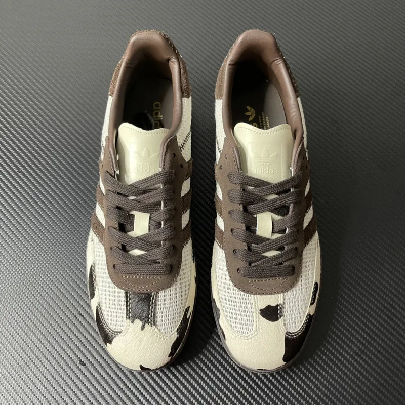 Cada elemento deste sneaker é uma narrativa visual da inspiração. O cabedal é uma fusão de um tecido de malha leve em um tom creme e sobreposições de “faux cowhide” (couro sintético com estampa de vaca) no antepé e no calcanhar, que remetem à estética natural e selvagem. A combinação de materiais e a construção de baixo perfil conferem uma profundidade visual única, enquanto as icônicas Três Listras serrilhadas em um tom contrastante adicionam um toque marcante e elegante.