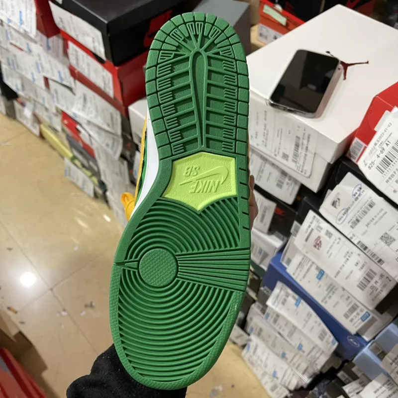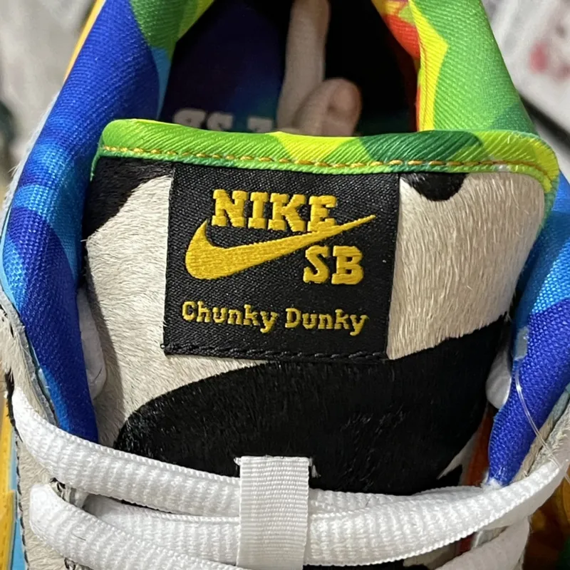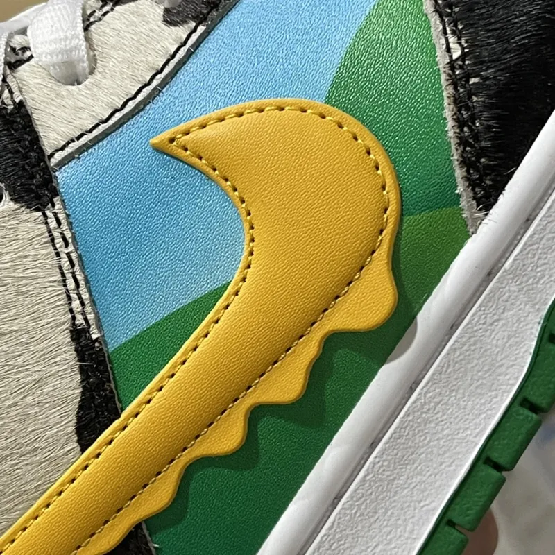O Nike SB Dunk Low “Ben & Jerry’s Chunky Dunky” é uma explosão visual que traduz o espírito divertido e irreverente da marca de sorvetes em um sneaker icônico. O cabedal combina couro branco liso com sobreposições em padrão de vaca, feitas em pelúcia sintética, criando textura e impacto visual. Detalhes em couro azul-céu representam um dia ensolarado, enquanto o Swoosh amarelo vibrante traz um efeito derretido, remetendo ao sorvete no calor. O interior multicolorido remete às embalagens da Ben & Jerry’s, adicionando mais personalidade ao design. A entressola branca com solado verde completa o visual, garantindo contraste e equilíbrio. Com materiais premium, acabamento detalhado e um storytelling único, o “Chunky Dunky” é mais que um tênis: é uma peça de coleção que une cultura sneaker, arte e sabor em um só produto.