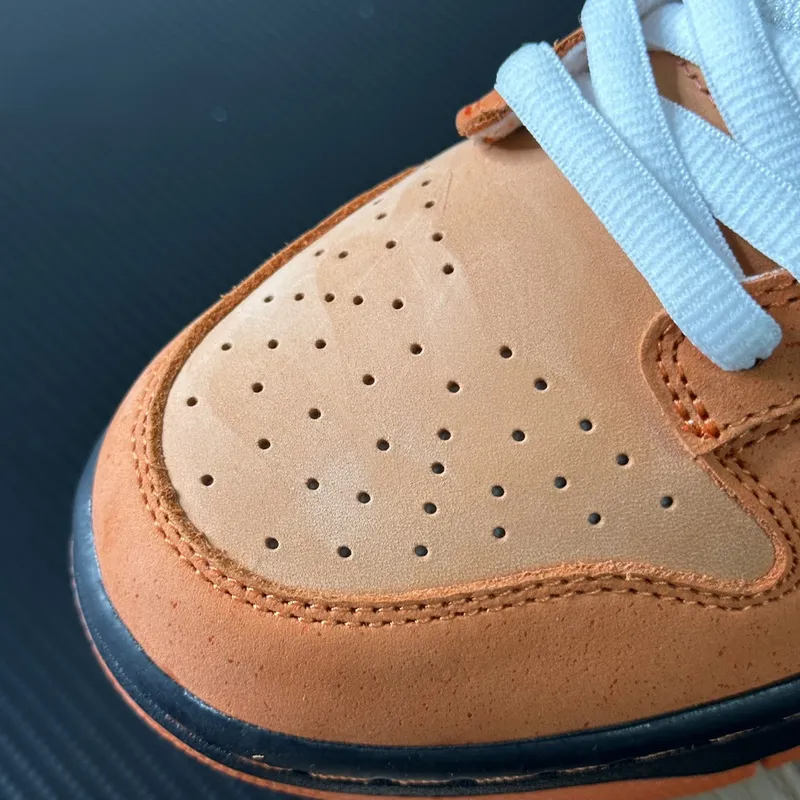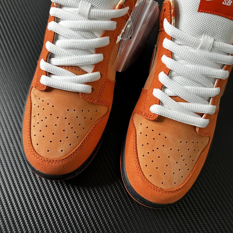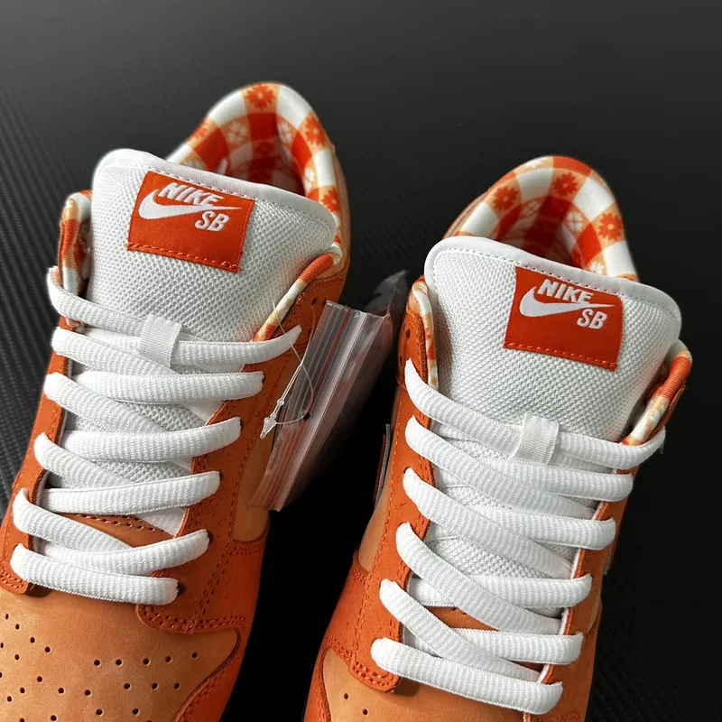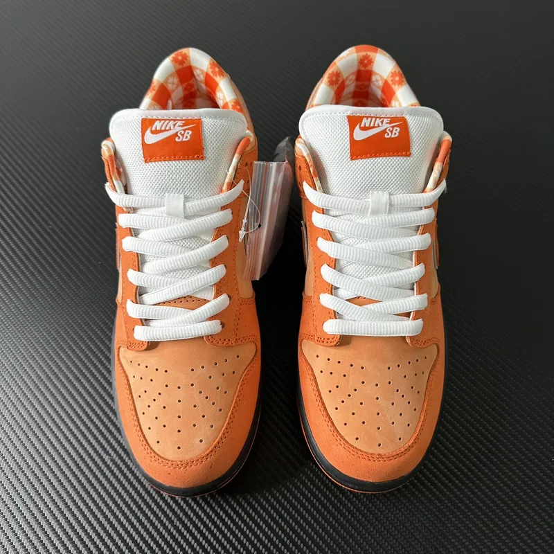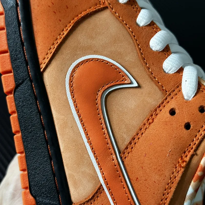 O Nike SB Dunk Low “Concepts Orange Lobster” é uma obra-prima que transforma o tema marinho em um design vibrante e colecionável. O cabedal em camurça premium mistura tons de laranja queimado e laranja vivo em sobreposições e painéis, criando um degradê que evoca a textura e a cor marcante de uma lagosta rara. Os detalhes pintados em branco sobre as sobreposições imitam o padrão natural da carapaça, reforçando a estética temática. O Swoosh lateral em couro preto com borda branca oferece contraste forte e sofisticado, enquanto a língua acolchoada em malha laranja mantém o conforto característico da linha SB. O forro interno traz o icônico padrão xadrez vermelho e branco — assinatura da colaboração com a Concepts — remetendo a toalhas de piquenique e restaurantes litorâneos, criando uma narrativa divertida e imersiva. A entressola preta, combinada com o solado em borracha laranja translúcida, equilibra robustez e impacto visual. Acompanhado de elásticos “garra” que simulam as cintas usadas para segurar as pinças da lagosta, o modelo une storytelling, materiais de alta qualidade e irreverência, consolidando-se como um dos Dunks mais memoráveis já lançados.