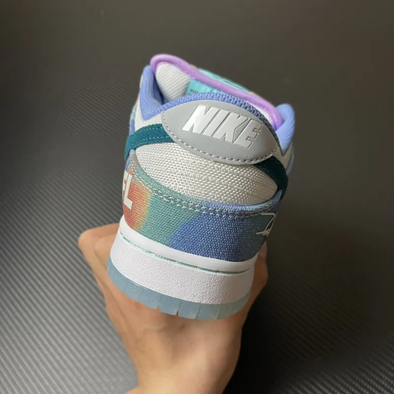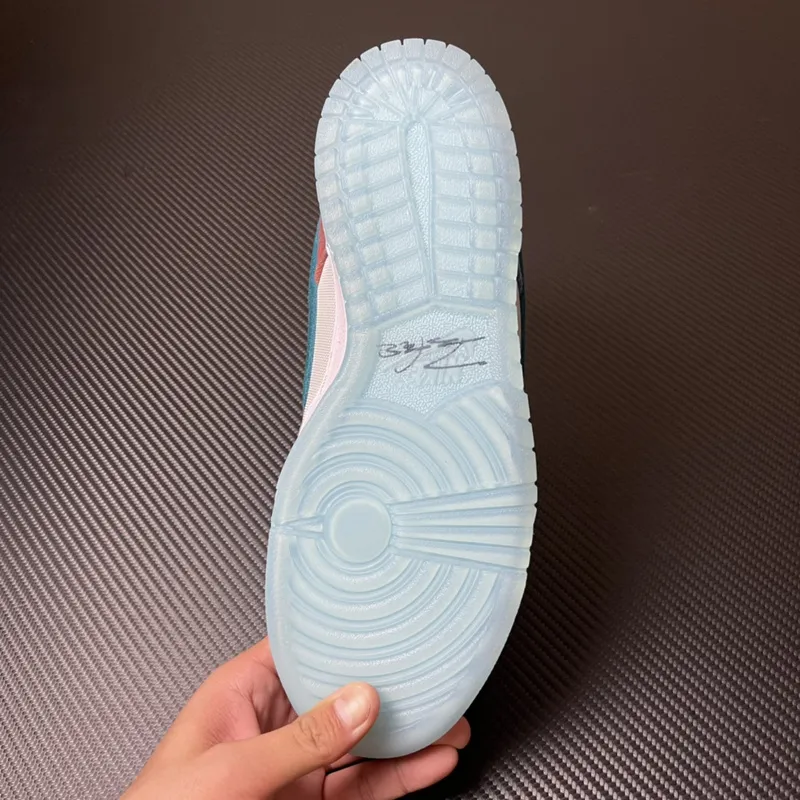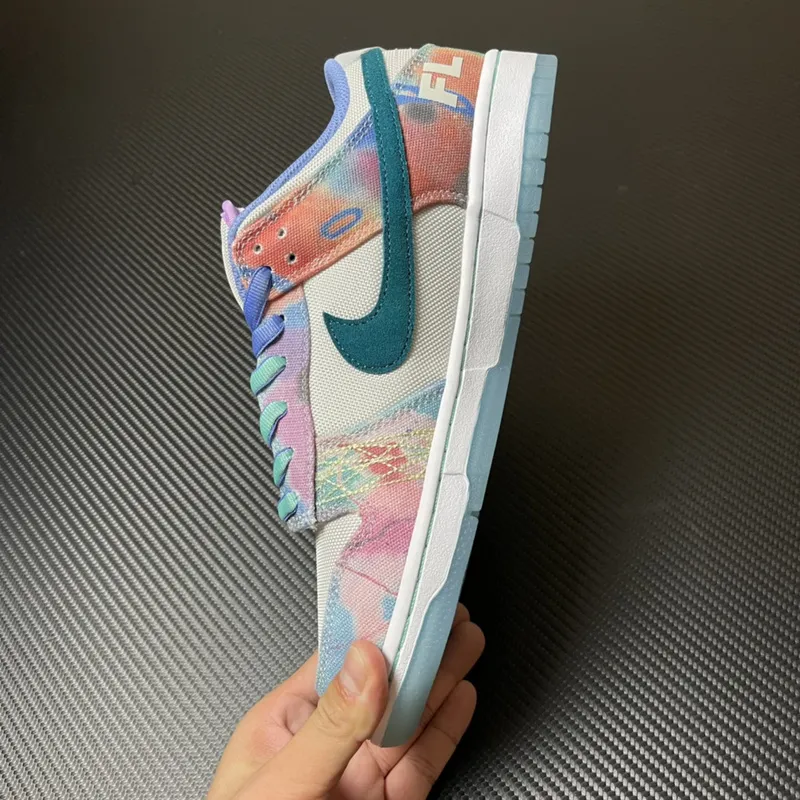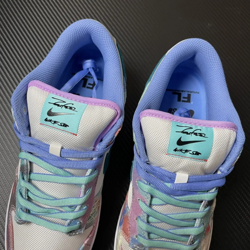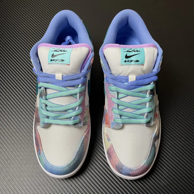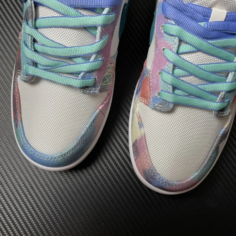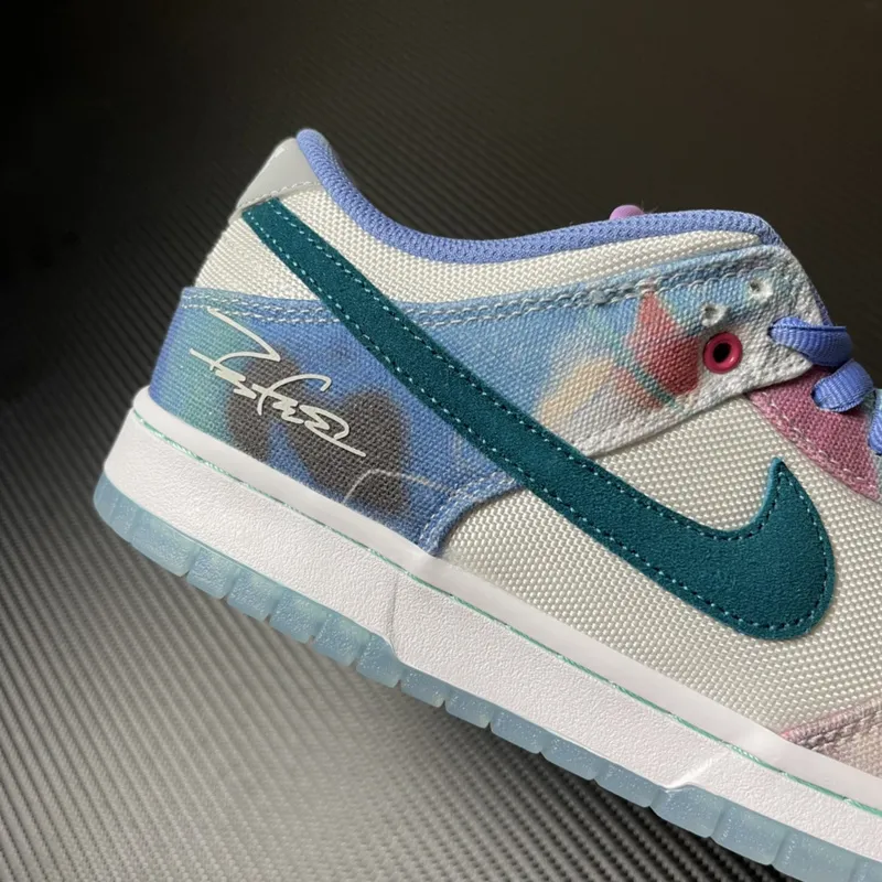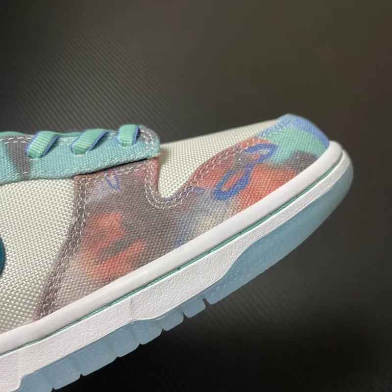 O Nike SB Dunk Low x Futura Laboratories “Bleached Aqua” é uma verdadeira obra-prima que une o legado do skate à visão criativa do artista e designer Futura. Inspirado por estética experimental e espírito urbano, este modelo apresenta um cabedal vibrante em tons de azul aqua e lilás desbotado, criando um efeito visual único que parece ter sido pintado à mão. Os painéis exibem sobreposições translúcidas e camadas de tecido que revelam nuances e grafismos, enquanto a assinatura artística de Futura aparece de forma sutil, reforçando o caráter exclusivo da colaboração. A malha respirável e o suede premium garantem equilíbrio entre conforto e durabilidade, enquanto a língua acolchoada e o colar reforçado oferecem o suporte característico da linha SB. A entressola branca contrasta com o solado semi-translúcido, que revela detalhes gráficos ocultos, transformando cada passo em parte da história. Cada elemento, do cadarço ao heel tab, carrega a identidade ousada e futurista da parceria, resultando em um sneaker que é, ao mesmo tempo, peça de coleção e ferramenta de expressão pessoal. Mais do que um tênis, o “Bleached Aqua” é um manifesto de criatividade e autenticidade — perfeito para quem vê o skate e o streetwear como plataformas de arte, e não apenas como estilos de vida.